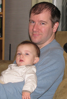 You have two teeth now. You're still pulling up on everything, but I've also seen you stand on your own for a moment, too. I've also watched you climb up onto a box of books to get at the television remote. I have a feeling that you're going to be a determined kind of kid. Fortunately, you're also a happy kid. You like to play peek-a-boo, and get tickled, and we always get big smiles when you see us. You have a funny laugh, kind of a burble-y giggle, and also this strange inhaling whistle-moan that always makes us laugh. You're hard to hold on to sometimes. When you get excited, you try to bounce up and down, and you're liable to head-butt whoever is holding you. When you see something that you're interested in, you'll just lean toward it all of a sudden. If there's ever a story that ends with you getting dropped on your head, it will be because of that.